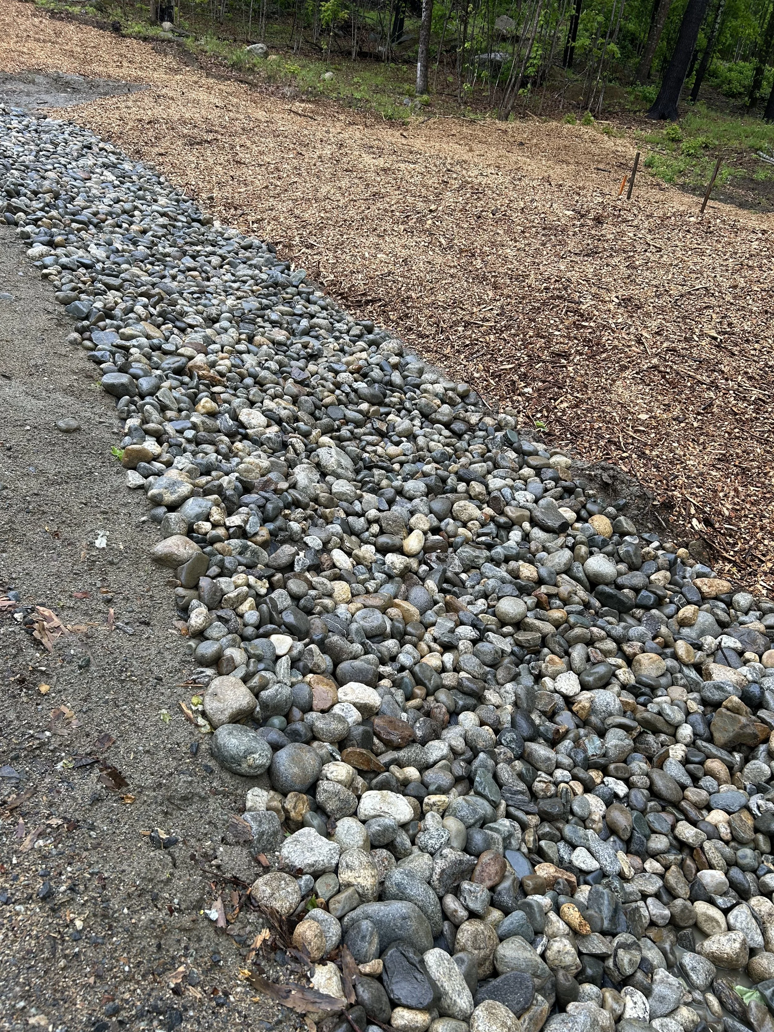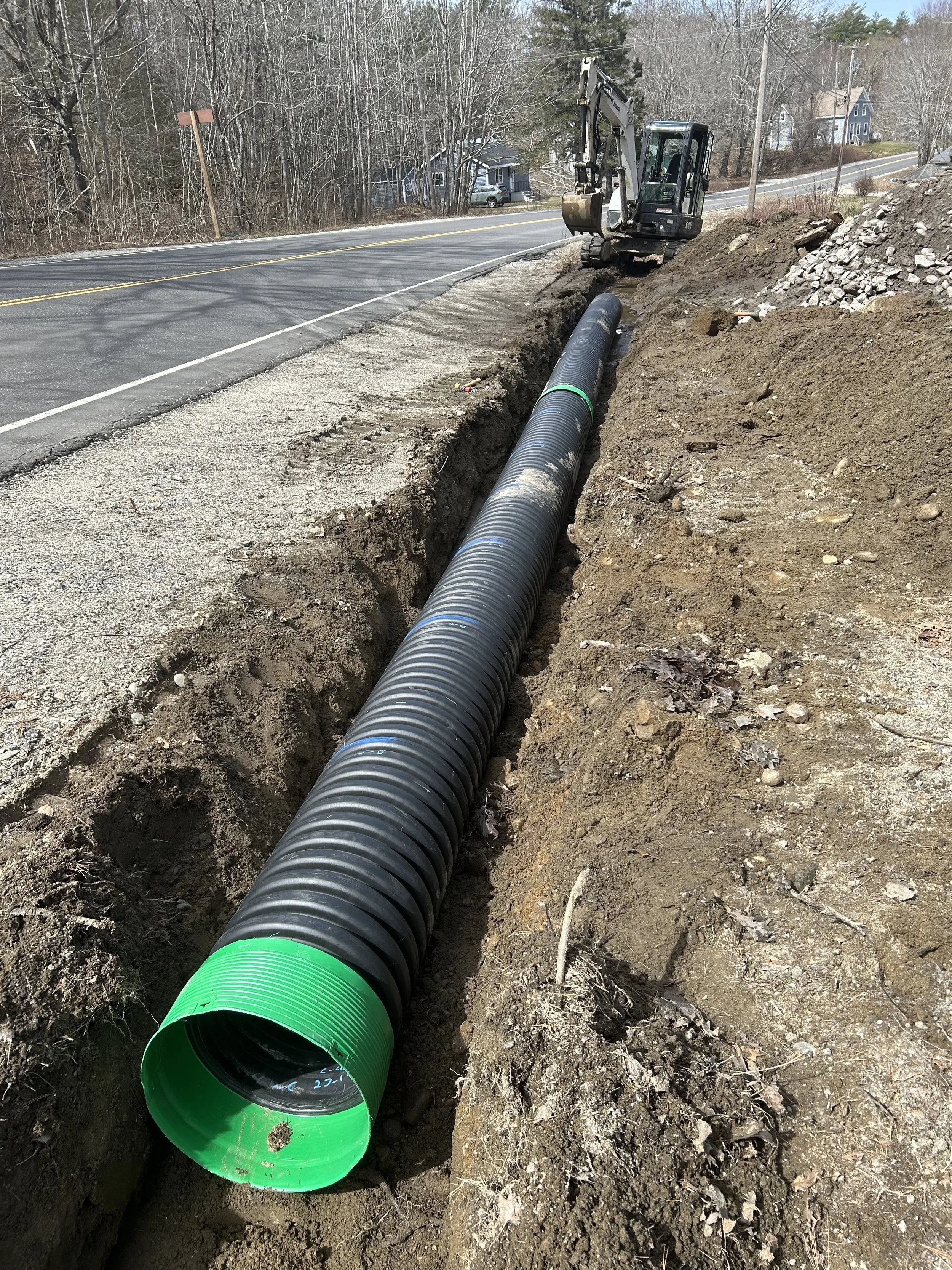 Under drainage is the next step to consider for areas with a lot of water movement. It is essentially perimeter drainage installed along the edge of your road. A crushed stone trench will allow relief for the water to flow and be directed into a culvert or natural drainage area…before that water can flow onto your road.